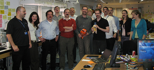 A few ThoughtWorkers decided to participate in Movember and one of them, Toni, is in our team. He has been growing his mustache for last three weeks, so this afternoon we decided to greet him with mustaches on all of our faces (including Baxter and Nemo!) when he came back from the coffee run.